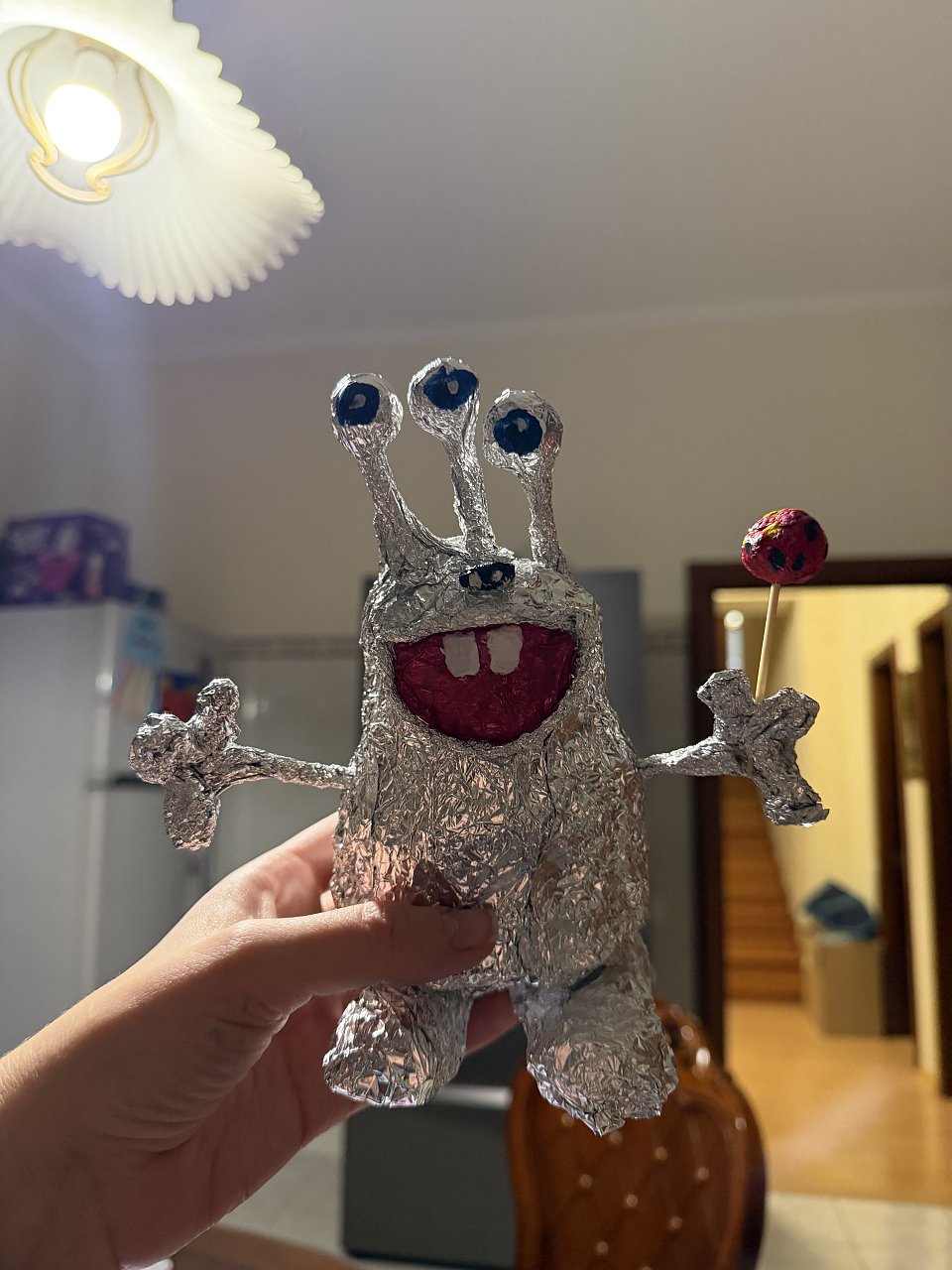 Делали вместе с младшей сестренкой инопланетянина. Каркас из бумаги, обернутый фольгой, частично покрашен гуашью