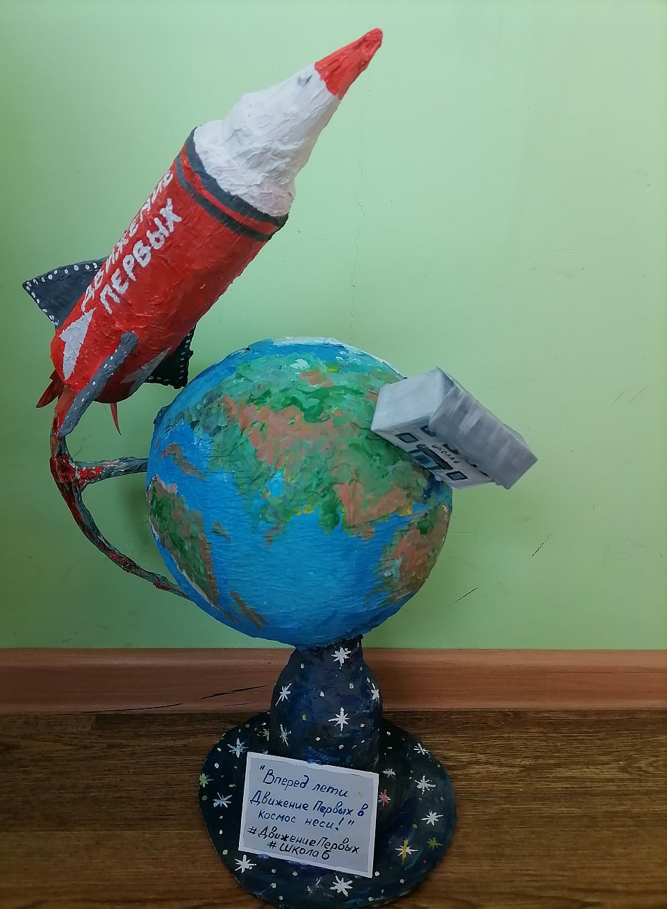 Работа выполнена в технике Декупаж. Макет земли, на которой расположена наша школа и ракета Первых с ребятами - активистами. Движение и активность ребят - это цель только вперед! Полет вокруг Земли - это цель и достижения нашей школы!