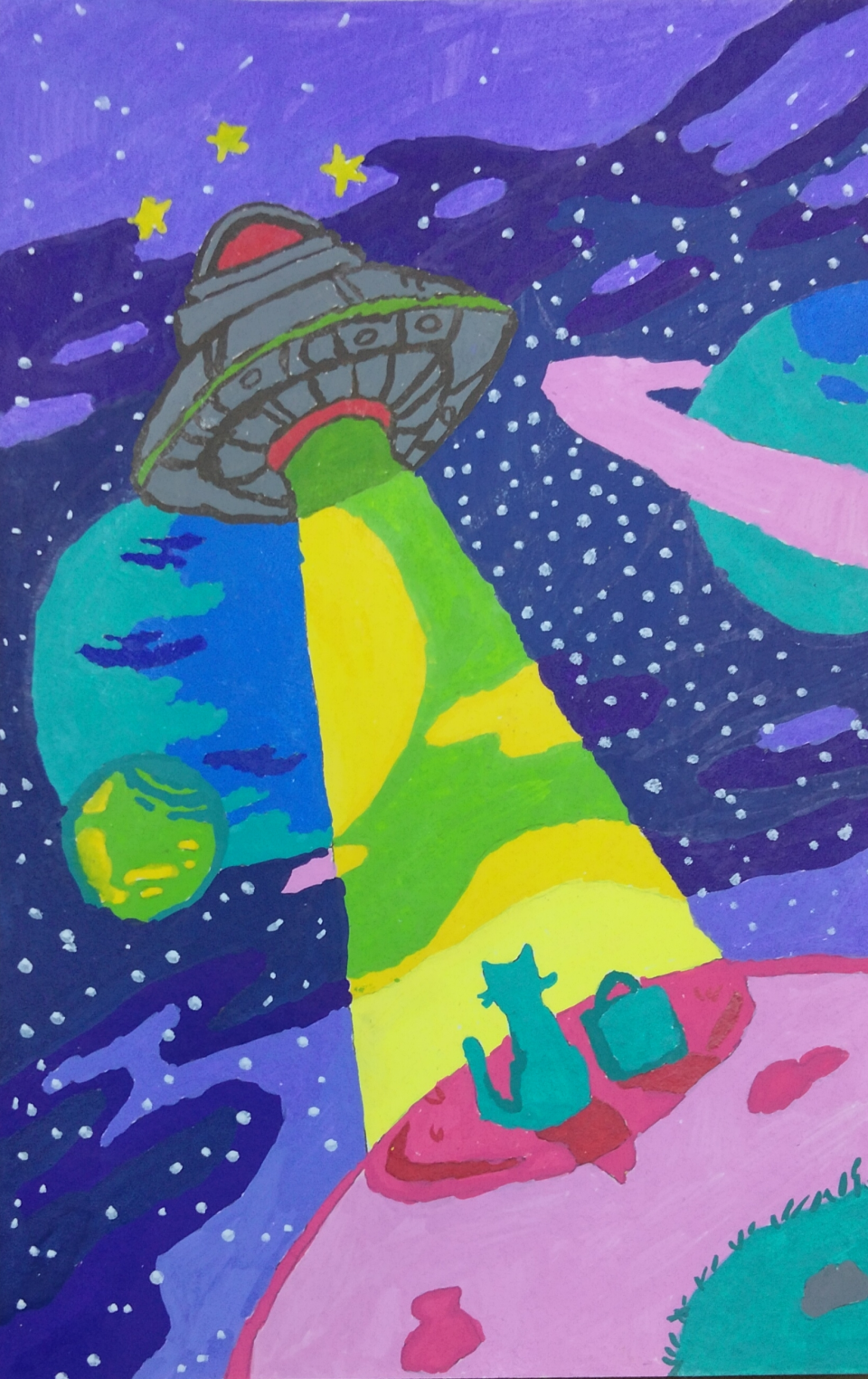 Использовались акриловые маркеры. аллегория на тему свободы, воображения и стремления к мечте. Тарелка, окрашенная в яркие цвета радуги, напоминает о детских сказках и фантазиях, где возможно всё. Планеты и звезды создают ощущение бесконечности космоса, а сами персонажи выглядят дружелюбными и приветливыми, будто приглашают зрителя присоединиться к этому удивительному путешествию.