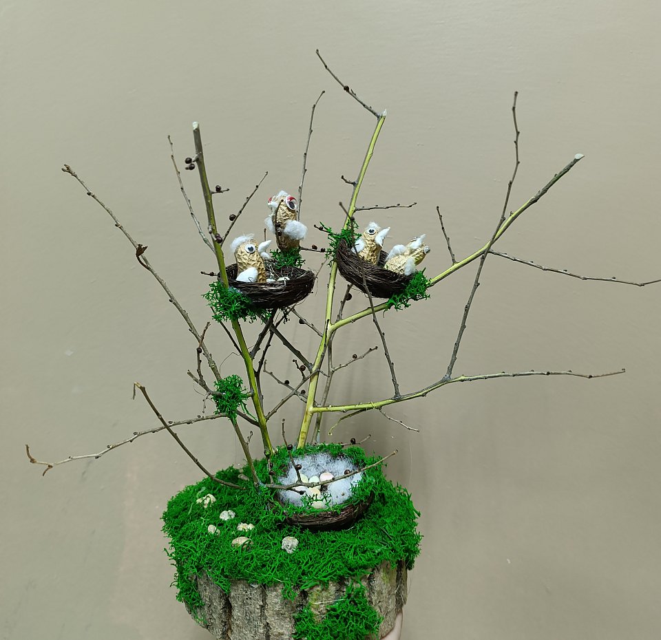 Дошкольник, работа выполнена из дерева, орехов, ваты, декоративного моха