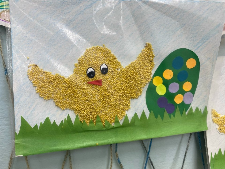 выполнено ребенком 2 лет. материалы катон, цветная бумага, пшено, клей, карандаш