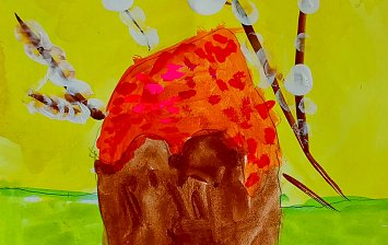 5 лет. Аппликация из нарисованных частей: акварель, фломастер, мелки, паетки, атласная лента, клей.