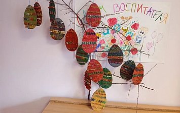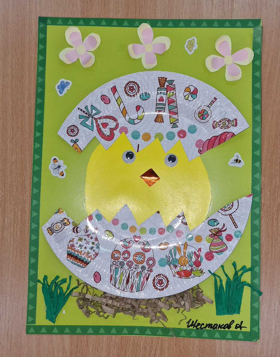 В аппликации «Пасхальный цыплёнок» использовалась гафрированная бумага зелёного цвета, для скорлупы бумажная тарелка, цветная бумага, бумага для подарков, наклейки, декоративные глаза