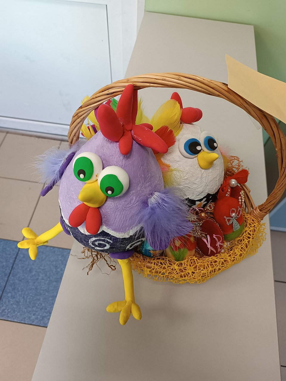 Петушок и курица: шарик, салфетки, клей ПВА, акриловые краски, воздушный пластилин, перья Яйца: деревянные в бархате, декоративная тесьма, бусины, валяние из шерсти, бисер, скорлупа обклеиная разными лоскутками
