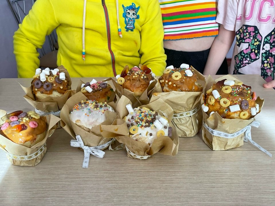Украшение куличей разными посыпками и кремом, выполнили школьники начального звена и спец. классы.