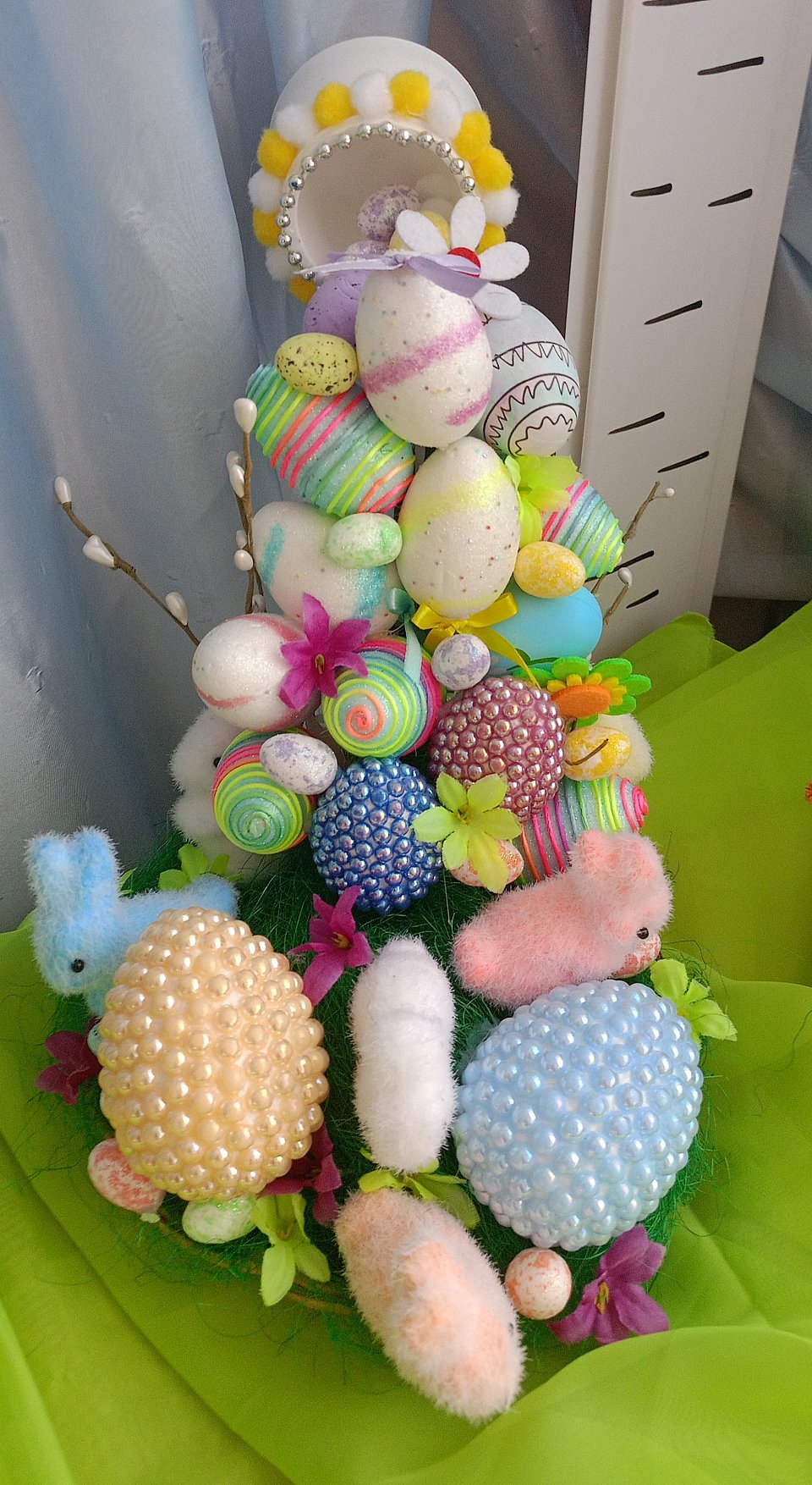 Работа выполнена из пенопластовых яиц разных размеров и форм (некототые с бусинами), яица окрашены в постельные тона, полосками, узорами. Присутствуют пушистые фигурки кроликов и цыплят, вербные веточки